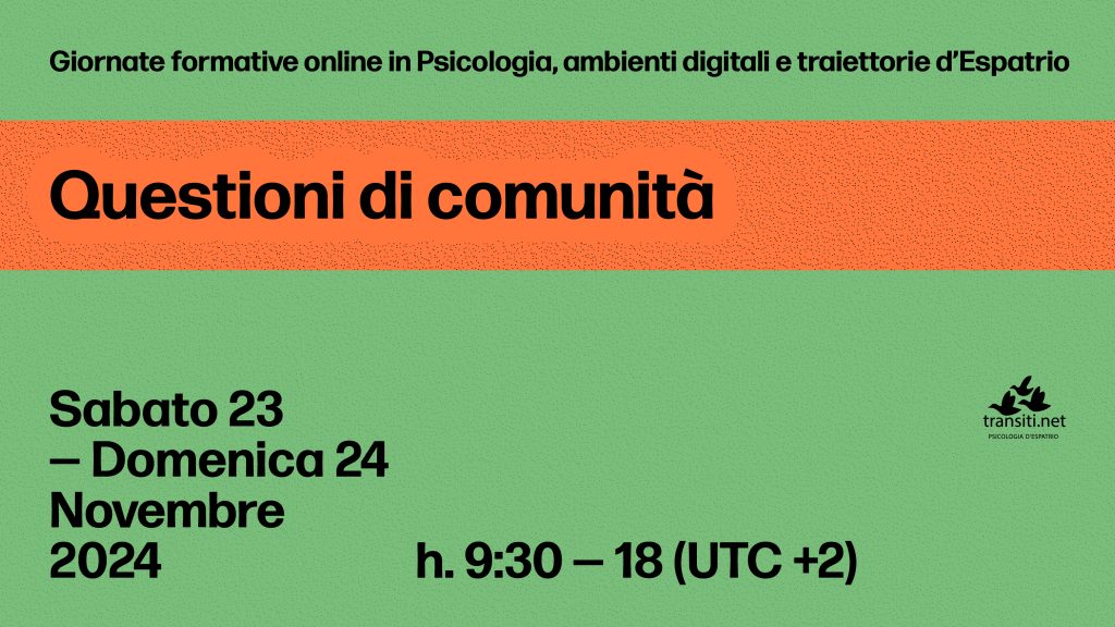 Per il secondo anno consecutivo, Transiti Psicologia d’Espatrio propone un percorso formativo online, rivolto a professionisti e professioniste interessati ad approfondire le tematiche della Psicologia Onlife e della Psicologia in contesti di Emigrazione. Questo evento formativo, previsto per il 23 e 24 novembre 2024, sarà un’occasione unica per riflettere su un tema centrale e cruciale: la comunità professionale e il suo ruolo nel benessere psicologico.